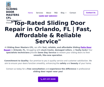 SLIDING DOOR MASTERS CFL provides expedited, dependable, and cost-effective patio sliding door repair services across Central Florida. Our expert technicians address various issues, including track malfunctions, roller damage, shattered glass and lock failures, ensuring your sliding doors operate smoothly. We are dedicated to superior service and client satisfaction, guaranteeing seamless door functionality, thereby enhancing your home's safety and aesthetic appeal. Schedule a complimentary consultation today to experience the benefits of professional sliding door repair. Same-day service is available. Affordable patio door repair. We offer Emergency Sliding Door Repair in Central Florida.