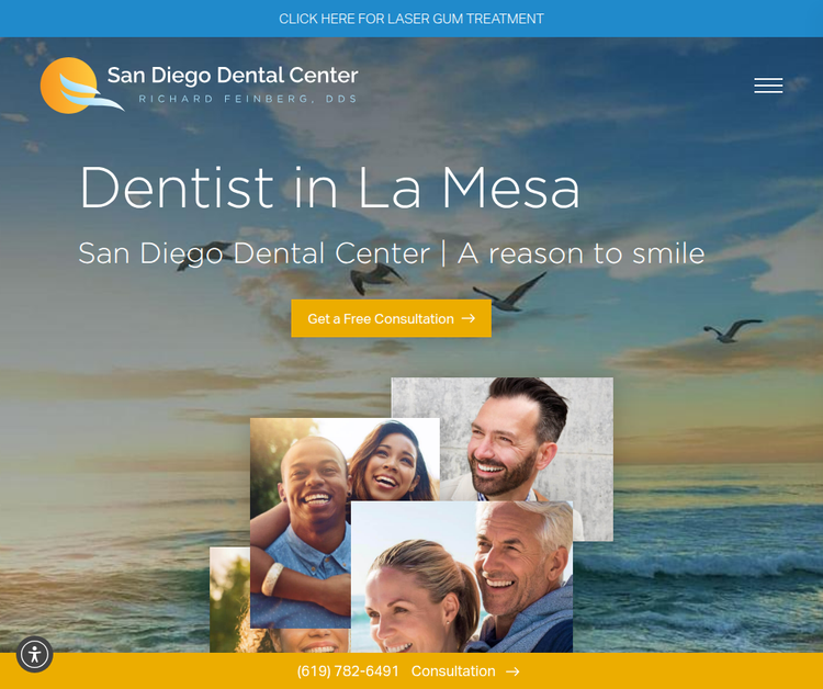 San Diego Dental Center in La Mesa is led by Dr. Richard Feinberg, DDS, board-certified prosthodontist with 33+ years experience and advanced training. Services include dental implants, All-on-4 full arch replacement, porcelain veneers, same-day crowns, Invisalign, Six Month Smiles, teeth whitening, full mouth reconstruction, dentures, sedation dentistry, laser dentistry, TMJ treatment, and sleep apnea treatment. Dr. Feinberg uses master ceramists and state-of-the-art technology including mercury-free dentistry. Known for exceptional hospitality with 425+ five-star reviews. Member of American Dental Association, American College of Prosthodontists, and American Academy of Cosmetic Dentistry. Free dental implant consultation valued at $425. Serving La Mesa, La Jolla, El Cajon, and San Diego.
