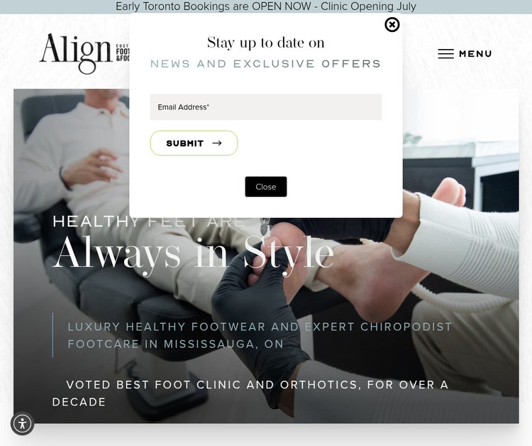Step into Canada’s first luxury medical footcare clinic—Align Custom Fit Footwear & Footcare in Mississauga. Led by expert chiropodists, our services combine spa-like experiences with advanced podiatric care, from our signature Body Align Assessments and custom Align Orthotics™ to medical pedicures and curated healthy footwear. We go beyond treating symptoms by addressing root causes like posture, gait, and foot biomechanics. With fashion-forward shoe options from top designers, a relaxing clinical space, and 3D technology for precise fit, Align helps patients move better, look better, and feel better. Whether you’re managing pain, preventing foot conditions, or simply want to walk in style, Align offers personalized, results-driven footcare. Voted best foot clinic and orthotics for over 10 years. Book your appointment today in Mississauga or visit our new Toronto location opening soon.