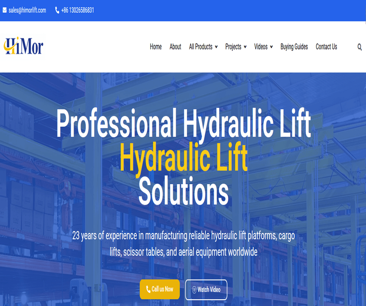 Himor Lift is a leading manufacturer of hydraulic lift solutions with over 23 years of experience in delivering reliable, high‑performance equipment worldwide. Our products range from cargo lifts and scissor lift tables to car lift platforms and aerial lifts, designed to meet the needs of industrial, commercial and residential customers.