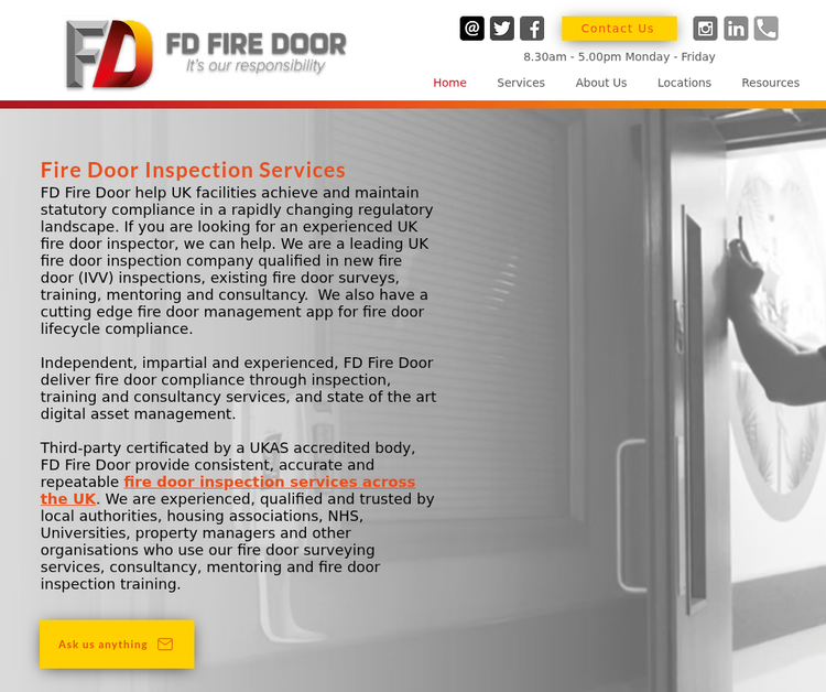 Our qualified team will ensure your fire doors are working as they should, and they're certified to meet current regulations. From NHS estates and educational establishments to housing associations, we provide fire safety you can rely on, using our fire door management software. Contact us : Phone: 01228 470470 Website : https://www.fdfiredoor.co.uk/ Email: mailto:enquiries@fdfiredoor.co.uk Address: Unit 1 James St Workshops, James St, Carlisle CA2 5AH Work hours: Mon - Fri 08:30 - 05:30 ; Sat - Sun : Closed Facebook : https://www.facebook.com/fdfiredoor/ Linkedin : https://www.linkedin.com/company/fd-fire-door Instagram : https://www.instagram.com/fd.firedoor/ X : https://x.com/FDfiredoor