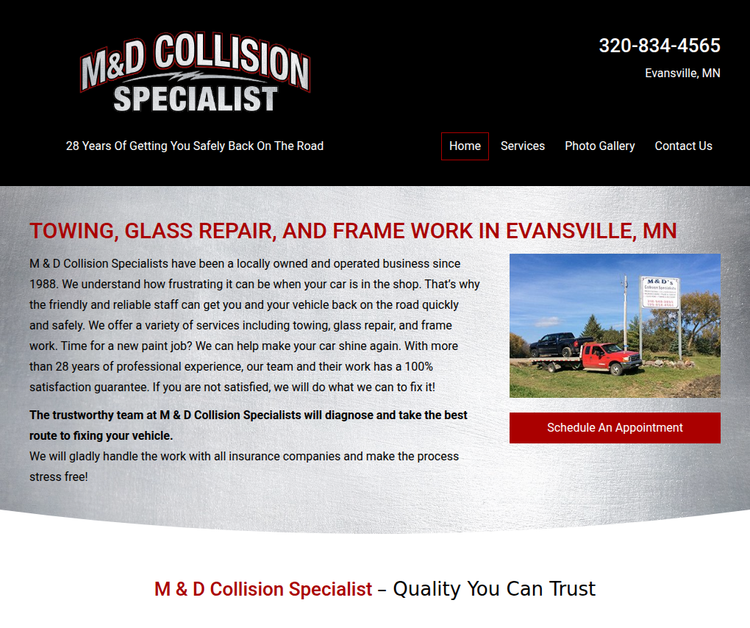 At M&D Collision Specialist, located in Evansville, we make your auto collision repair experience as smooth as possible. We are adept in auto collision and frame work, bringing years of professional experience to bear on every job. Choose M&D for quality workmanship, outstanding customer service and a reputation for timeliness and reliability. Phone: 320-834-4565