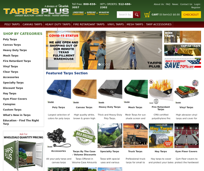 Tarps Plus is an online store that sells various types of tarps including poly, canvas, heavy duty, mesh, fire retardant, vinyl, large, clear, specialty, and hay tarps, gym floor covers, tarp canopies, and pop up tents.