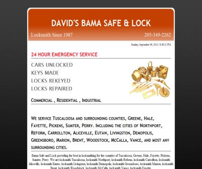 Bama Safe and Lock providing the best in locksmithing for the counties of Tuscaloosa, Greene, Hale, Fayette, Pickens, Sumter, Perry and for the cities of: Tuscaloosa, Northport, Reform, Carrollton, Aliceville, Eutaw, Livingston, Demopolis, Greensboro, Mar