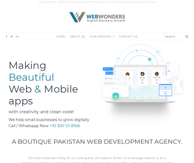Web Wonders is a team of professionals, passionate dreamers and experienced website designers and developers. We love to design ideas into websites and ultimately websites into successful businesses. We are located in Karachi but we work with clients all over Pakistan and overseas.Apart from creating websites that are user friendly, following international standards, abiding the rules of search engines which leads to get better brand awareness, drive more traffic, generate quality leads and ultimately increase sales, we focus on customer satisfaction more than anything else.We are based in Karachi, Pakistan and all of our work is being done in house by our highly trained and skilled designers and developers. Web Wonders never outsource any of their projects. We prefer our designers and developers work directly with clients as we find this approach generate better results and our clients feel more comfortable as well.