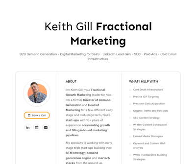 Keith Gill, your Fractional Growth Marketing leader, specializes in accelerating tech start-ups'' growth. With 10+ years'' experience, he crafts GTM strategies, drives inbound traffic, and boosts SERP rankings for organic traffic. Get a Free SEO audit and affordable demand generation services on a monthly retainer.