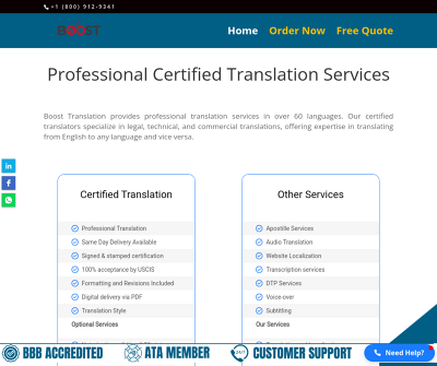"Boost Translation LLC is a premier language services provider specializing in expert translation solutions across 60+ languages. Known for their precision and cultural sensitivity, their team of certified translators excels in delivering accurate legal, technical, and commercial translations tailored to client needs.With an easy-to-use online platform, Boost Translation ensures a seamless process for clientssimply upload documents, select services, and get high-quality translations priced competitively at $25 per page (up to 250 words).A proud member of the American Translators Association (ATA), Boost Translation also offers editing, proofreading, and interpreting services, maintaining the highest standards in linguistic expertise."