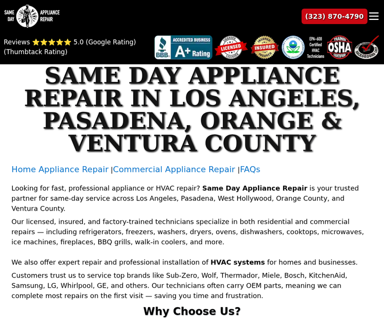Same Day Appliance Repair has become a cornerstone of reliable appliance and HVAC solutions across Southern California’s most dynamic cities. From the bustling streets of Los Angeles to the upscale neighborhoods of Beverly Hills, and from the family‑friendly suburbs of Pasadena to the business hubs of Irvine and Thousand Oaks, our five fully staffed regional branches—West Hollywood, Pasadena, Los Angeles, Thousand Oaks, and Irvine—ensure that a certified, factory‑trained technician can arrive at your home or office within the same day you call. With more than a decade of collective experience, our team works with every major brand, including Sub‑Zero, Wolf, Thermador, Bosch, Miele, KitchenAid, Samsung, LG, Whirlpool, GE, and many more, giving you confidence that your valuable equipment is in capable hands.