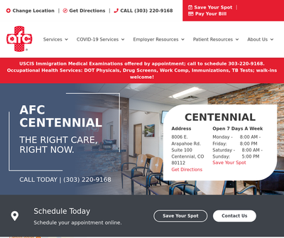 AFC Urgent Care Centennial is a walk-in urgent care facility serving Centennial, CO, as well as Greenwood Village, Southglenn, Lone Tree, and Littleton, CO. Visit us today for urgent care, injury treatment, illness diagnosis, x-rays, STD testing, lab testing, school & camp physicals, and more. Same-day visits are accepted and we maintain short wait times at our Centennial, CO urgent care center.
