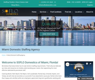 SOFLO Domestics is a full-service household staffing agency, specializing in the placement of nannies, governess, baby-nurse, housekeeper, houseman, laundress, butler, house manager, estate manager, personal assistant, personal chef, chauffeur, body guard and all other household staff. We serve Miami, FL and the surrounding areas.