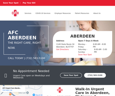 The Right Care. Right Now. AFC Urgent Care Aberdeen is a walk-in clinic, urgent care center, & COVID-19 testing center serving Aberdeen, NJ. Book online or visit today at our urgent care!
