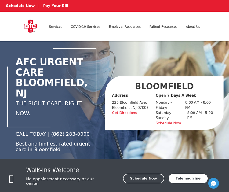 The Right Care, Right Now.AFC Urgent Care Bloomfield goes beyond broken bones, offering everything from flu shots to physicals. Were dedicated to quality care and patient satisfaction so that you can live life uninterrupted. Our center is staffed by physicians, and we offer extended weekday hours. Were also open on the weekend. Theres no need to make an appointment, walk-ins are always welcome. A visit to AFC is only a fraction of an emergency room trip cost, making it the smart alternative to the ER in non-life-threatening situations.