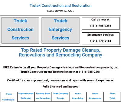 Trutek Construction and Restoration is a fully licensed and insured restoration, plumbing and reconstruction company. We have over 20 years of experience in the services we offer.Our services include property damage cleanup for water, fire, flood, sewage, mold, asbestos, and all types of property damage both residential and commercial.Our construction services include, water proofing, plumbing, HVAC, bathroom, kitchen, basements, extensions, dormers and partial or whole house renovations.
